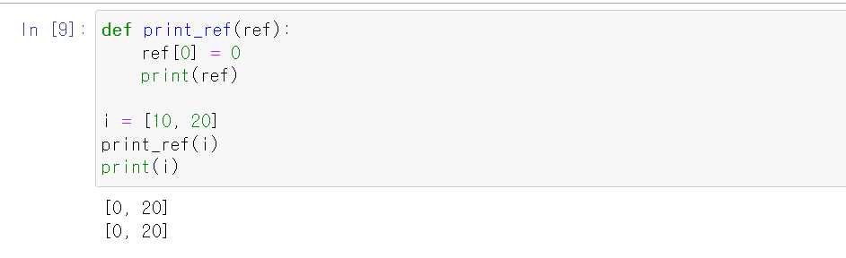 Call by Refrence의 예씨로, print_ref 함수를 호출 뒤엔 i값이 실제로 바뀐다. 함수에 인자를 넘길 때 값을 복사한 것이 아니라 ref[0]을 통해 참조하고 있는 리스트의 주소를 넘겼기 때문에 함수 내에서 바뀌기 때문에 외부에서도 변경된다.