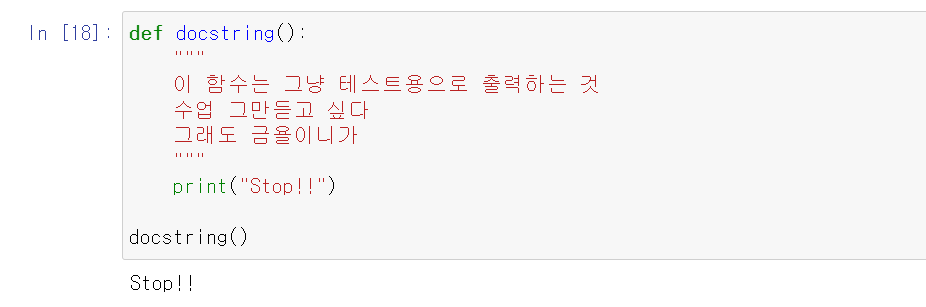주로 함수명 아래에 세 개의 따옴표로 docstring 영역을 표시함.
