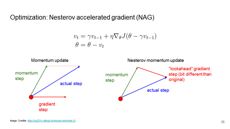 momentum과 gradient 값이 더해져 실제값을 만드는 모멘텀과 달리 momentum이 적용된 지점에서 gradient값이 계산된다. 따라서 미리 방향을 예측하고 해당 방향으로 얼마나 미리 이동한 뒤 gradient를 계산하는가에 대한 효과를 얻을 수 있다.