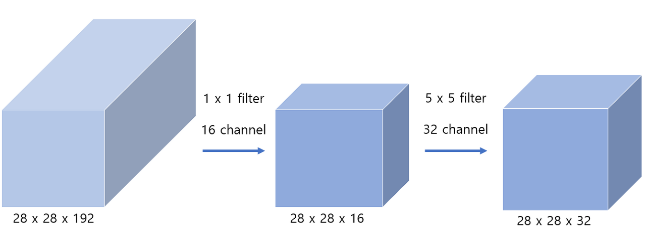 (b)의 차원 축소는 1x1 conv filter의 bottleneck 구조로 이루어진다.