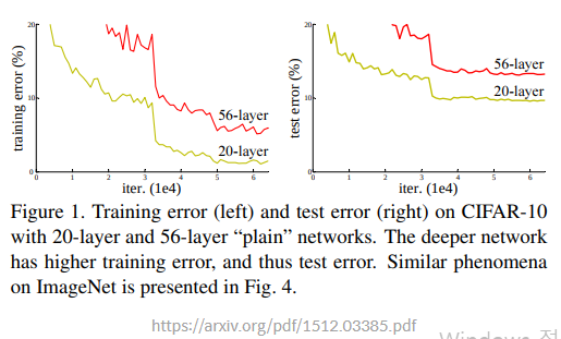 기존 네트워크에서 layer의 깊이를 깊게 쌓을 수 없는 이유로는 Degradation problem이 있다. 이는 레이어가 깊어지는 경우 모델이 수렴했음에도 최적화 이슈로 training/test error가 커지는 현상이다. 이 현상의 원인으로는 과적합이라고 많은 사람들이 생각했지만, ResNet 논문에 따르면 과적합인 경우 training error는 작아야 하는데 이 문제가 발생한 경우 56층의 layer가 20층의 layer보다 training/test error가 모두 낮은 점을 들어 이것이 오버피팅이 아닌 최적화로 인한 문제라고 밝혔다.
