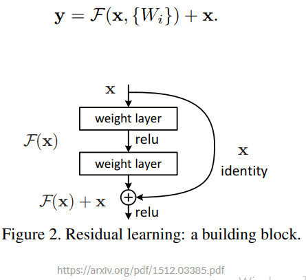학습 할 레이어 \(H(x)\)를 \(F(x) + x\)의 구조로 만드는 경우 레이어의 입력값 x가 더해지는 구조로 만들어지기 때문에 Vanishing gradient로 인해 \(F(x)\)의 값이 0이 되더라도 학습할 내용인 \(H(x)\)는 x가 더해진 상태이기 때문에 성능이 저하되지 않는다. 그리고 모델이 학습하며 가중치를 조절해야할 \(F(x)\)는 \(H(x)\)에서 x를 뺀 형태이기 때문에 잔차의 형태를 띈다. 따라서 residual neural network라는 이름이 생긴 것.