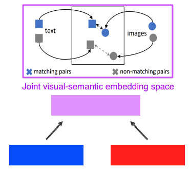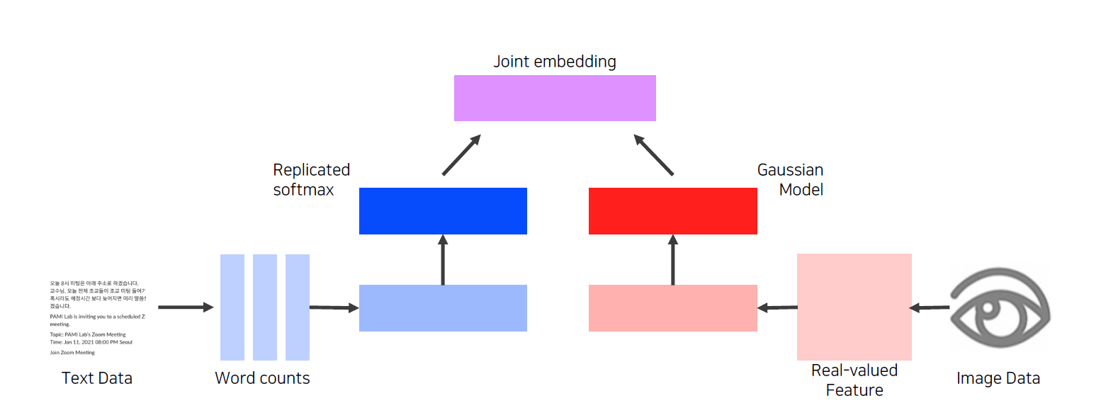 위 그림에서 Text data / Image data는 각각 Word counts, Feature map 등의 처리를 거쳐 Gaussian model과 Replicated softmax등의 함수를 거쳐 이미지 차원과 텍스트 차원의 유사도를 포함한 Joint embedding을 진행한다.