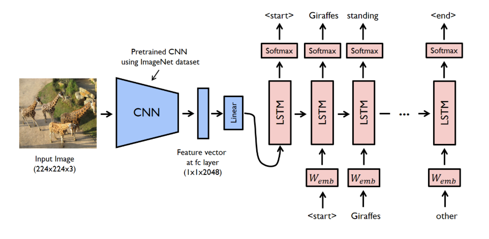 CNN의 input image가 FC layer를 거치며 선형적 linear 결과값으로 나오기 때문에 이미지의 특징점을 잡을 수 있기 때문에CNN의 최종 output이 아닌 FC layer를 거친 Last hidden layer를 decoder의 input으로 넣어 LSTM을 통해 문장의 구조를 학습한다.