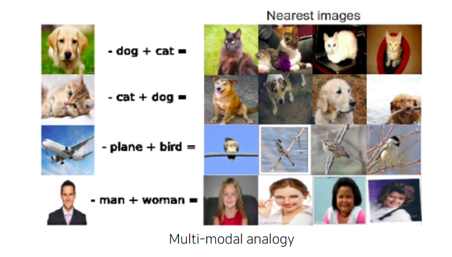 이런 작업을 통해 dog 이미지에서 dog 이라는 text를 빼고 cat이라는 text를 더하는 경우 Nearest images에 고양이 사진들을 학습하는 등 Image tagging이 가능하다.