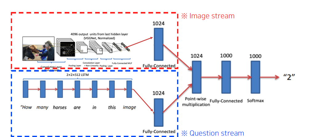 Image stream과 Question stream을 통해 이미지 내의 상황에 대해 문제를 내면 이에 대해 대답하는 모델도 있다.