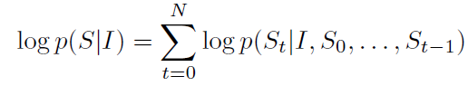 여기서 이미지를 설명하는 답에 대한 확률은 고정된 수식이 아닌 Chain Rule에 따라 \(S_{0}, ...., S_{t-1}\)까지의 확률을 결합확률로 나타낸다. (이미지 I 에 대해 0번째 단어가 S0일 확률) x (이미지 I와 S0에 대해 1번째 단어가 S1일 확률) ....