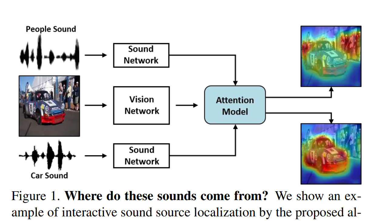 visual net / audio net 두 부분에서 각 결과를 통해 Attention model을 거쳐 이미지 내의 장소에 대한 localization score를 계산하고 visual net의 feature를 합해 output을 뽑아낸다. Loss의 계산에는 supervised loss, unsupervised metric learn.loss등 다양한 방법으로 loss를 계산할 수 있다.