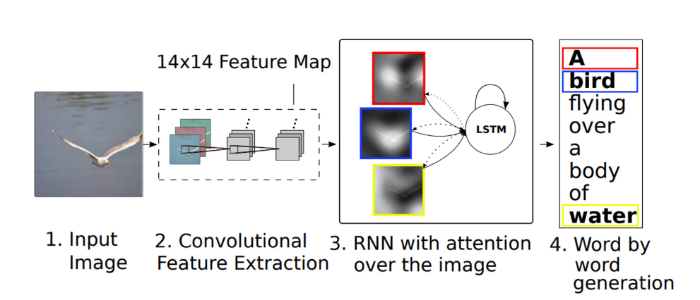 구성은 Show and tell과 마찬가지로 input image에 대한 CNN encoder와 LSTM으로 이루어진 decoder에서 LSTM 과정에 attention 개념을 통해 이미지의 특정 부분에 집중하는 경향을 두어 word generation의 성능을 높였다.