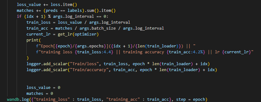 내 코드에서는 train 과정이 끝나는 곳에 wandb.log에 training_loss, training_acc를 기록하고 step = epoch로 설정해 1 epoch마다 기록되게 했다. for문 내부에 설정하는 경우 잘못 설정하면 1epoch가 아닌 매 step 마다 기록되어 모든 순간순간마다 기록되거나 하는 문제가 생길 수 있기에 조심해야 한다.