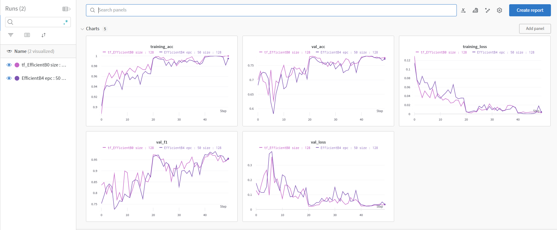 위 과정들이 끝나면 wandb 사이트에 로그인하면 내가 설정한 project name에서 각 run들의 비교도 가능하고, 그래프도 볼 수 있다. 아직 완벽히 익숙하진 않지만 이 정도면 기본적인 사용은 가능한 것 같다.