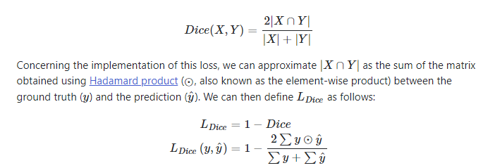 확률적 관점으로 접근해 \(Dice(X,Y)\)에 대해 계산하고 이를 1에서 뺀 \(L_{Dice}\)를 Loss function으로 사용할 수 있다.