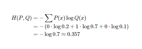 다음의 식으로 변경이 가능하며 2번 클래스로 예측한 확률이 가장 높기 때문에 실제 확률 분포의 확률 분포가 [0, 1, 0] 으로 one-hot encoding 된 상태라면 정답이다.