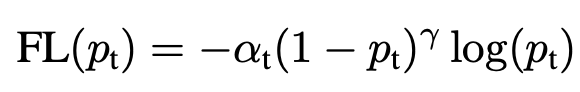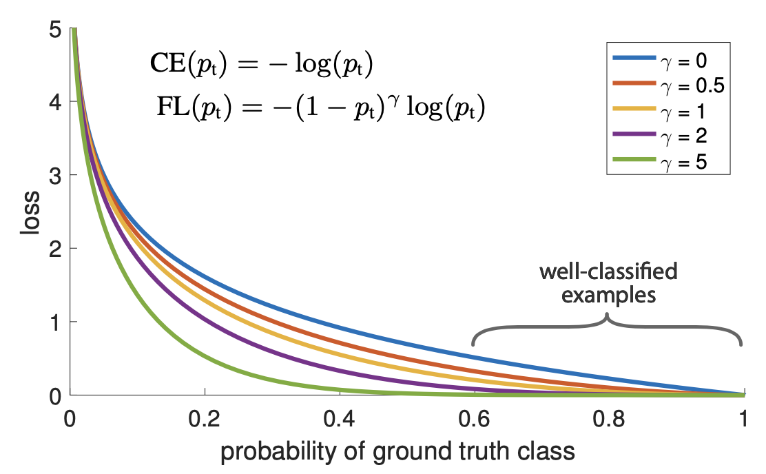 감마값을 조정하지 않은 파란색 선이 일반적인 Cross Entropy Loss이며 이에 비해 x축인 예측 확률값이 낮을 때 보다 확률값이 높은 경우 loss를 낮게 준다. 즉 Cross entropy 식에서 \(-(1-p_{t})\gamma\) 텀이 추가된 식이다.
