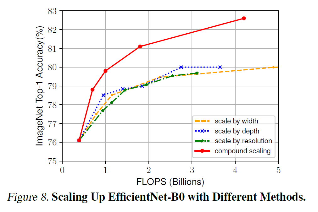 각 변수를 scale한 표를 보면 compound scaling의 성능이 압도적으로 높은 것을 볼 수 있다.