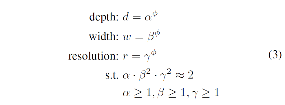깊이에 비례하는 계산량과 나머지 두 변수에 대해 제곱으로 비례하는 계산량을 조절하기 위해 다음과 같은 비율로 변수들을 조정한다.