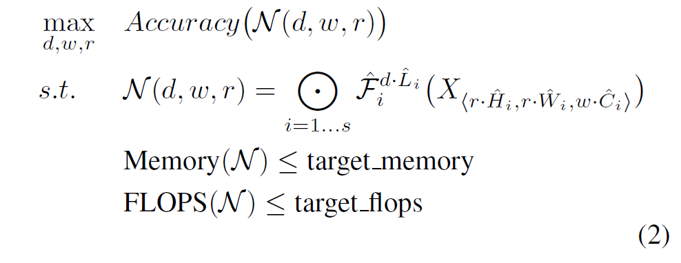 depth, width, resolution 3가지 변수에 대해 각 레이어에서 수행하는 연산 (F)를 고정하고 d, w, r의 변수를 조정하여 search space를 줄이는 문제이다. (기존의 ConvNet 수식에서 F의 제곱인자에 d가, X 내의 각 함수들에 r, w 상수가 생겼다.)