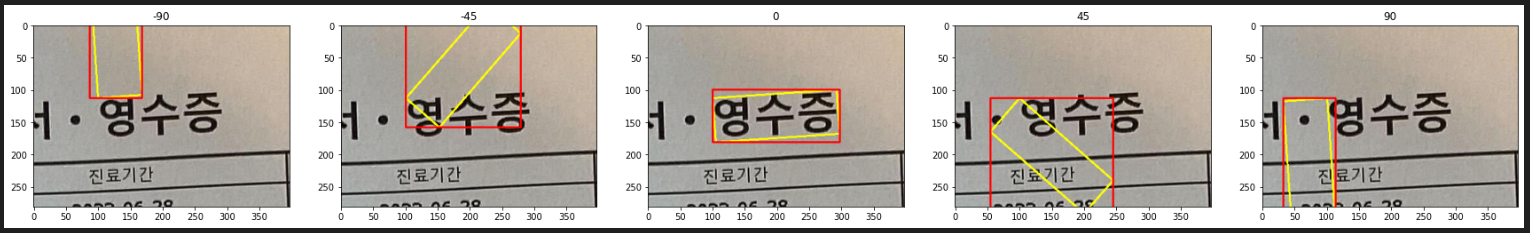 맨 왼쪽의 오렌지색 박스는 theta값 -4도 만큼 돌아간 bbox이고, 이 주황색 박스를 가장 tight하게 잡는 핑크색 박스를 구한다. 그리고 이를 다시 돌아갔던 theta값 만큼 (+4도) 돌려주면 3번째 이미지의 핑크색 박스가 나온다.