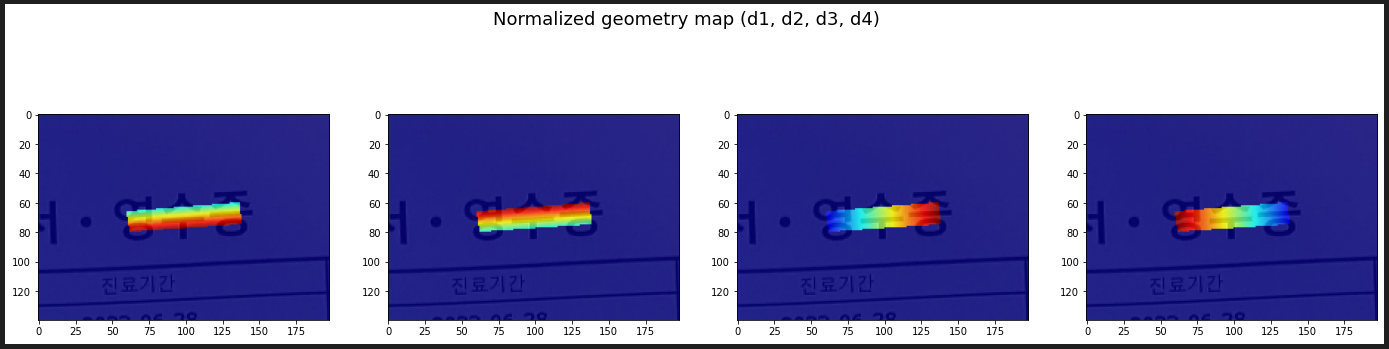 상/하/좌/우 방향으로 픽셀로부터 글자 박스 경계선까지의 거리를 예측하는 채널 d1, d2, d3, d4