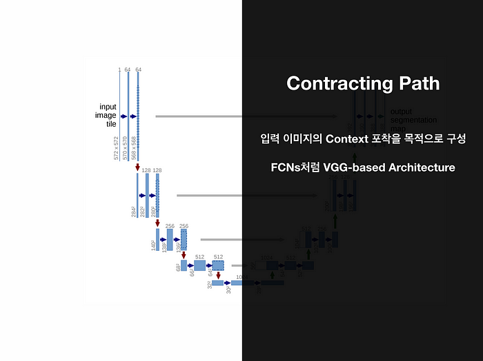 전체 구조가 U의 형태로 대칭 구조를 가지고 있다. 이 대칭 구도는 수축하는 단계인 Contracting Path,
