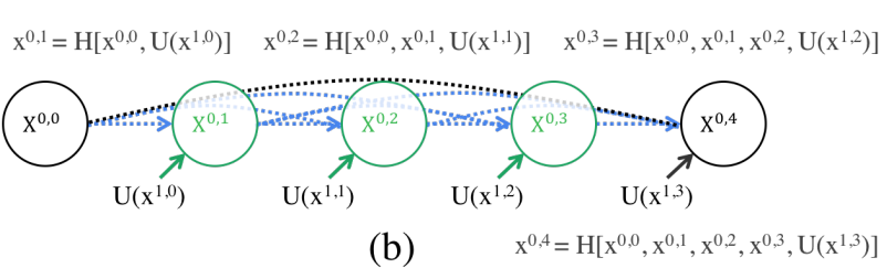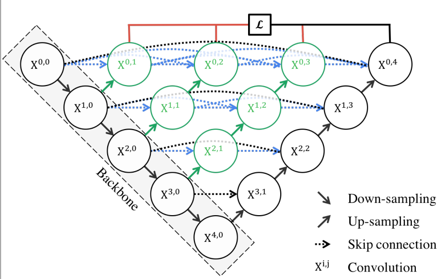 위와 같은 구조로 Connection의 방식이 기존의 U-Net은 X0,0 에서 X0,4로 가는 한 방향만 있었다면