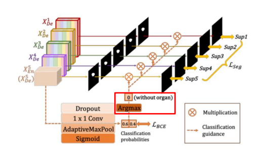 high-level feature map를 사용해 Dropout, 1x1 conv, AdaptiveMaxPool, Sigmoid를 거쳐 객체가 있으면 1, 없으면 1을 출력해 각 low-layer마다의 결과를 곱해 한 개라도 0이라면 결과값이 0이므로 noise를 최소화 가능하다.