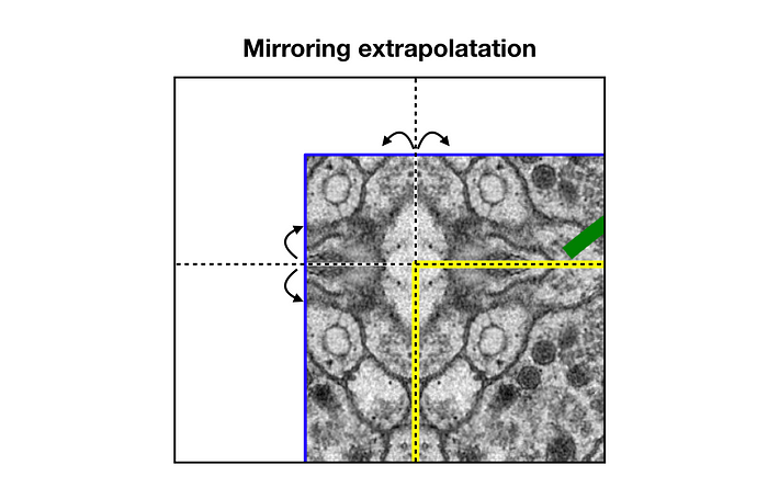 세포와 같이 밀접하게 붙어있는 객체에 대해서 경계를 포착하기 위해 사용하는 방법으로 extrapolatation이라는 방법을 사용했다. 이는 경계 부분 픽셀에 대해 0 또는 임의의 패딩값 대신에 경계 부분을 거울에 반사된 것처럼 확장을 시켜 확장을 진행한 것이다.