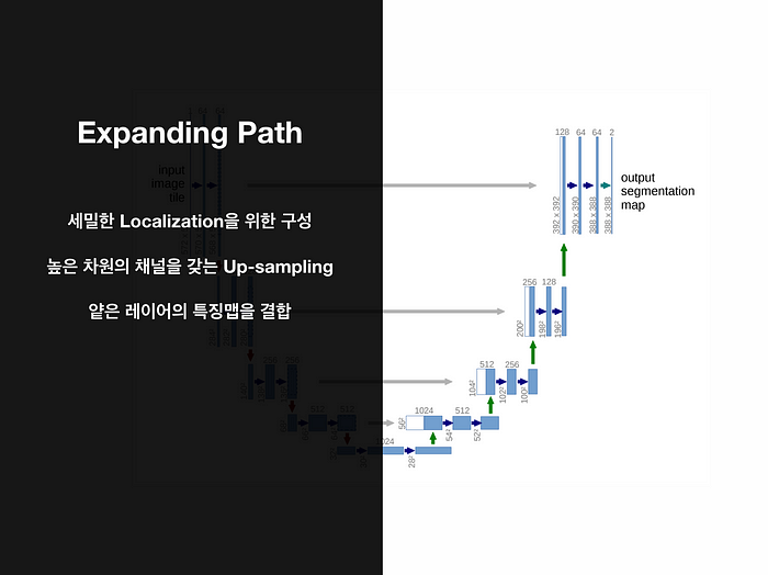 따라서 각 Expanding step마다 2x2의 Up-convolution 연산을 수행하고, Feature map의 크기가 이 단계마다 두 배로 늘어난다.