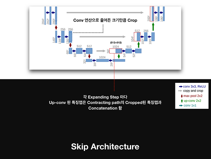 또한 FCN에서 등장한 Skip Connection 역시 지원해 각 수축 단계에서 나오는 feature map들은 확장 단계를 진행할 때 동일한 레벨의 feature map들과 concat 연산을 수행하며 DenseNet 형식과 같이 이전 레이어들의 feature map 정보를 함께 사용하는 구조로 이루어진다.