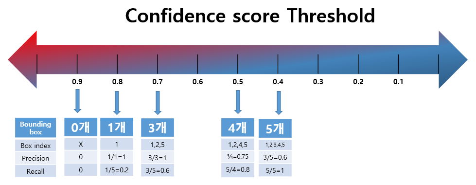 위 그림과 같이 Confidence score에 따라 bounding box가 여러 개 잡힐 수도 있으며, 아예 잡히지 않을 수도 있다. 그리고 Precision, Recall값 역시 달라진다.