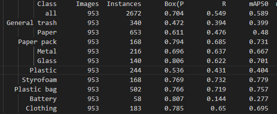 mAP는 각 class에 대한 AP를 구하고 이에 대한 평균으로 가장 오른쪽의 지표들이 그 점수이다. 상대적으로 데이터 수가 적었던 'Battery' class가 AP가 낮으며, 데이터가 많았던 class들의 AP가 높았다. 그리고 이에 대한 평균인 mAP는 0.589였다.